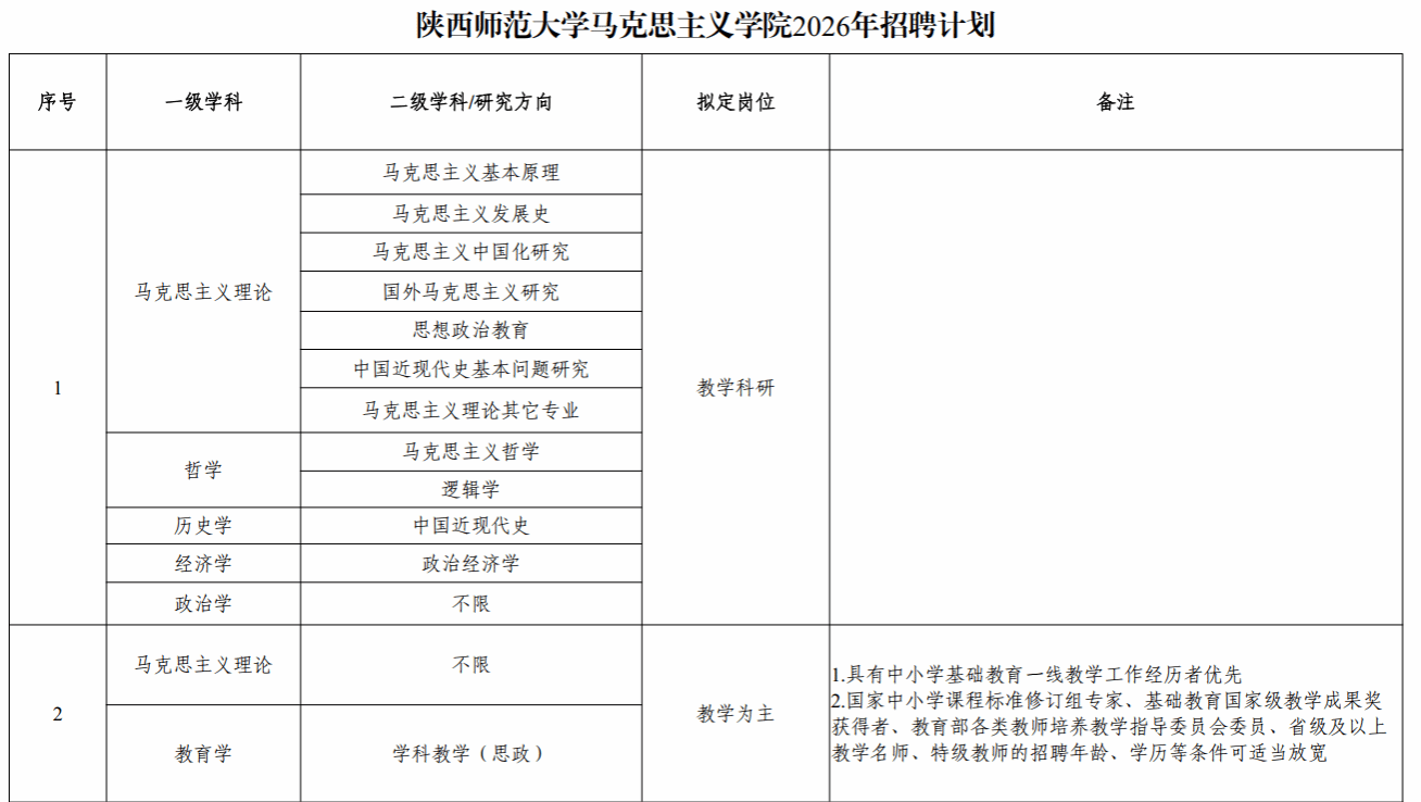 3.陕西师范大学马克思主义学院2026年人员补充计划有效期至2026年12月31日,教学科研人员须在学校审批通过之日起1年之内按规定办理相关入职手续。