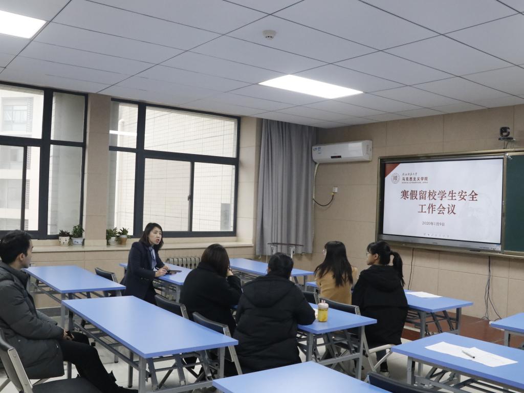 为落实党委学工部(学生处)《关于做好2020年寒假期间学生教育管理服务工作的通知》的相关要求,做好学院假期留校学生教育管理服务工作,确保学生度过一个安全、祥和、充实的假期。1月9日下午,我院2020年寒假留校学生安全工作会议在文澜楼教师能力训练室召开。学院党委副书记屈桃、本科生辅导员陈超、假期留校的研究生及本科生参加了会议。会议由本科生辅导员陈超主持。会上,陈超对学院2020年寒假留校学生情况进行了简要介绍...
