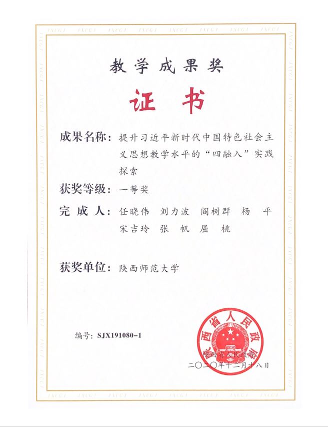 近日,陕西省人民政府办公厅通报了2019年陕西省高等教育教学成果奖的评选结果,我院任晓伟教授主持的《提升习近平新时代中国特色社会主义思想教学水平的“四融入”实践探索》获评陕西省高等教育教学成果奖一等奖。陕西省高等教育教学成果奖每两年评选一次,是陕西省高等教育领域中最高层次的奖励。近年来,我院高度重视教育教学成果奖的培育工作,通过培育教学成果奖激发全院教师重视教学、投入教学和钻研教学的积极性,从而不...