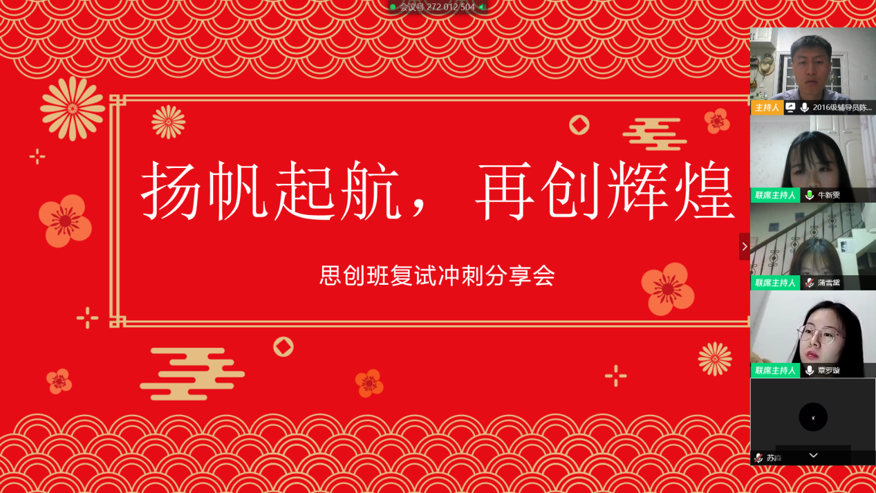 为进一步做好我院2020届毕业生升学与就业帮扶工作,保障疫情之下毕业生就业工作不受大影响。学院创新思路,落实“互联网+就业”方针,特推出“凭‘云’逐梦,战‘疫’前行”毕业生空中辅导系列活动,首场“考研篇——复试答题与面试”专题直播活动于3月25日晚在腾讯会议平台顺利举办。学院2019届优秀优秀毕业生牛新雯、覃罗璇及2016级思想政治教育(创新实验班)全体考研学生参加本次活动。活动由2016级本科生辅导员陈超主持。...
