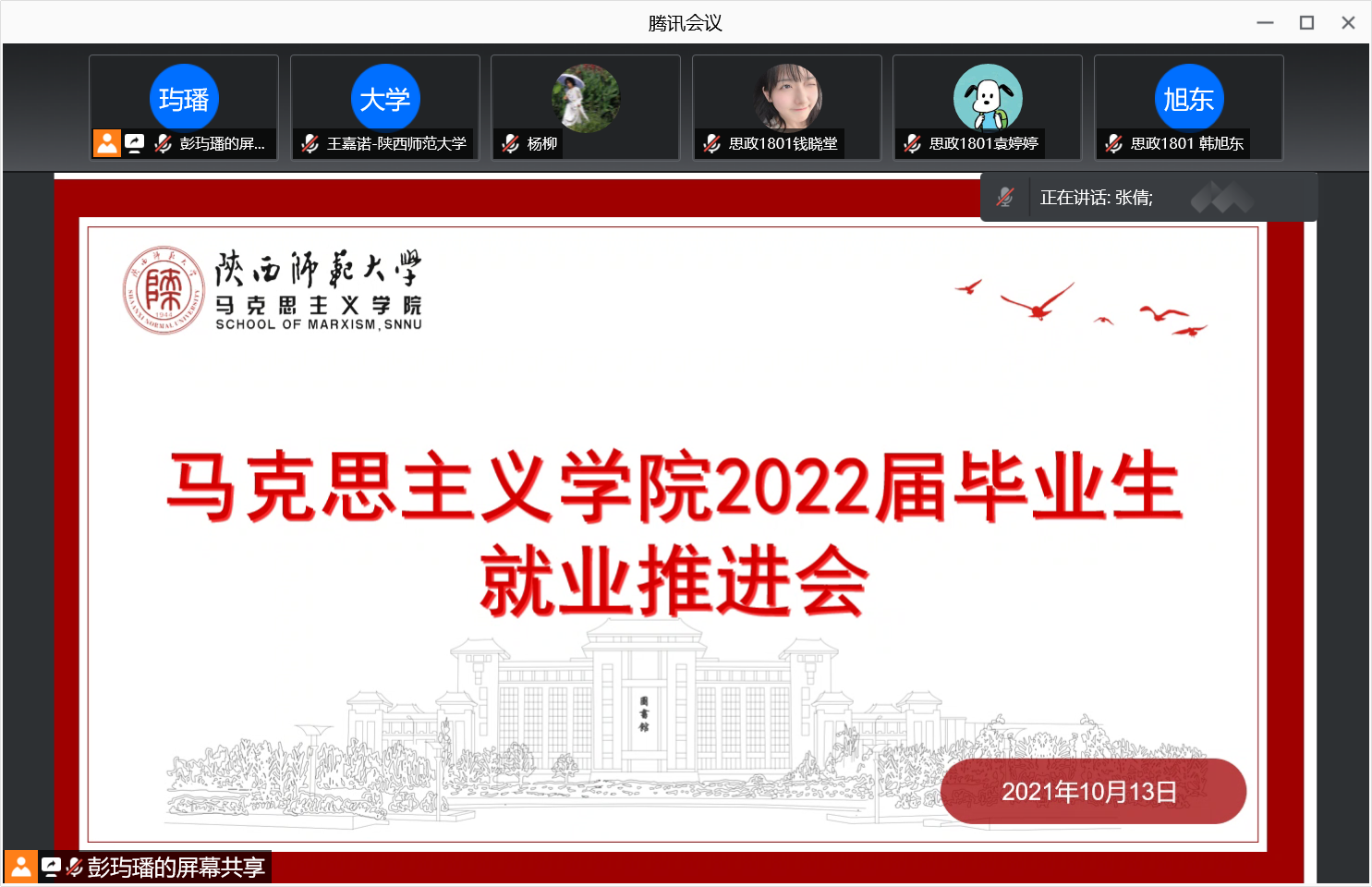 为进一步落实应届毕业生就业工作,提高马克思主义学院本科毕业生就业质量,鼓励大家积极就业充分就业,10月13日晚,学院通过腾讯会议召开2022届毕业生就业推进会。马克思主义学院党委副书记张倩及2022届全体本科毕业生参加了本次会议,会议由2018级本科生辅导员杨子熙主持。杨子熙向全体参会学生传达了我校2022届毕业生就业推进会会议精神,主要从就业信息获取、就业材料发放、就业协议签订三个方面对毕业生进行指导,希望毕...